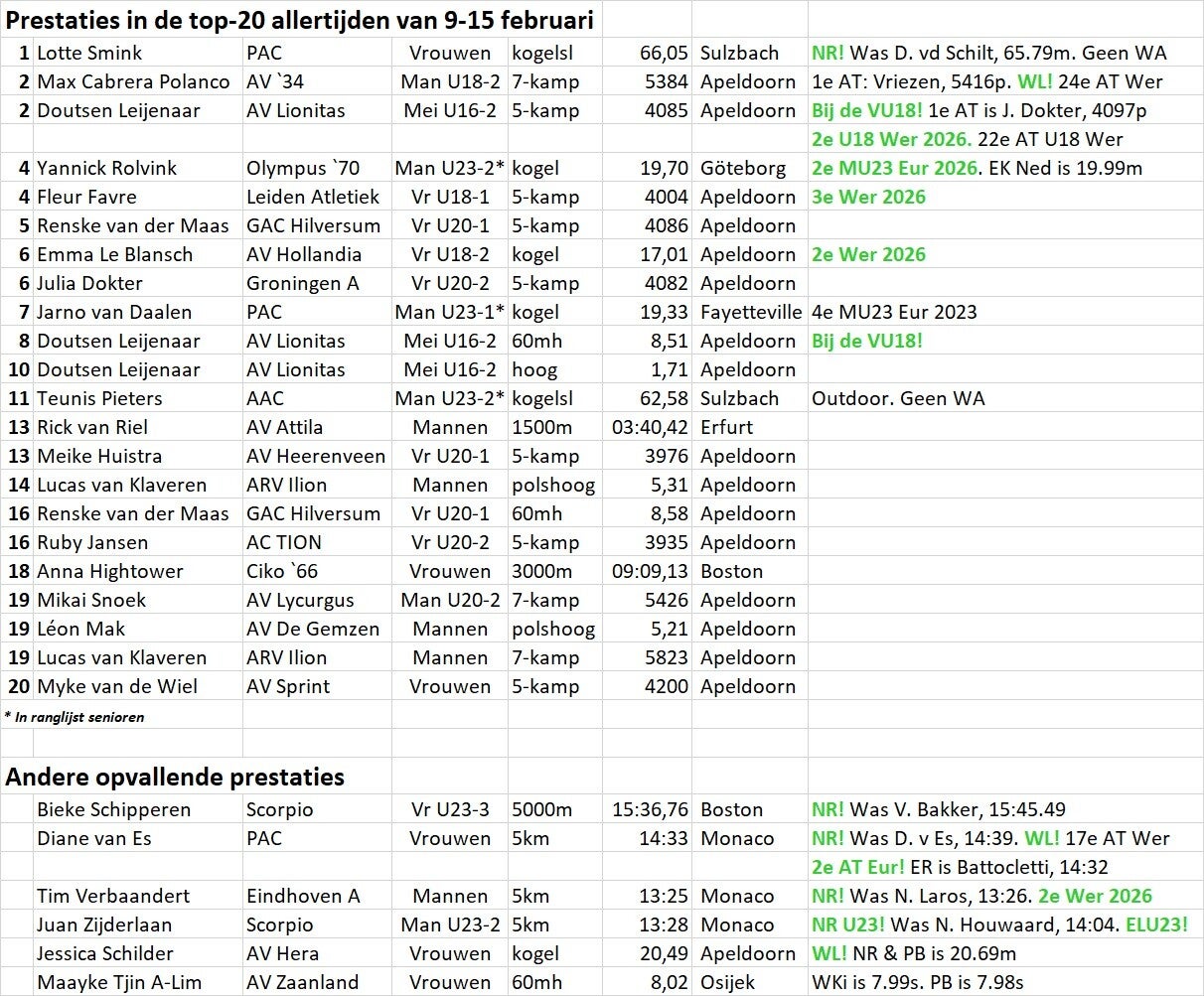 Weekoverzicht 16-22 februari (excl. NK U20/U18)