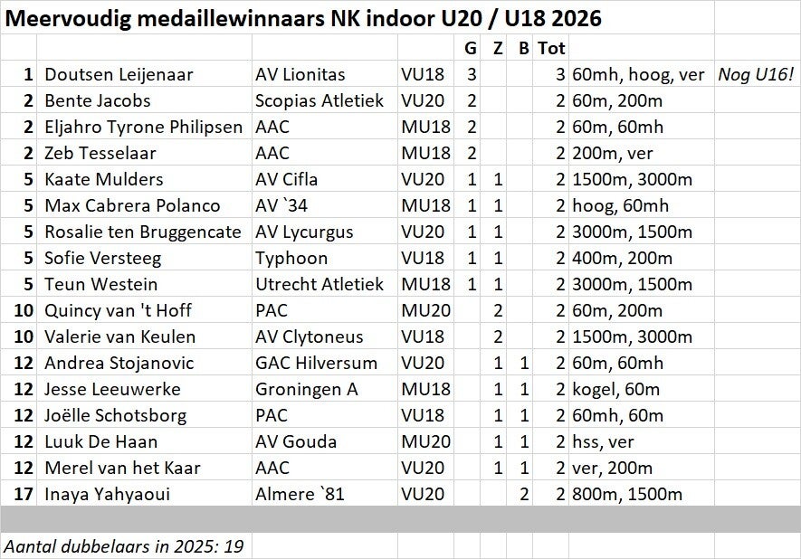 Met 4 Nederlandse Records en 7 Kampioenschapsrecords leverde het NK indoor U20/U18 veel meer topprestaties op dan in de afgelopen jaren. In 2025 was er 1x een 1e plaats AT, en werden er 4 kampioenschapsrecords gevierd. In 2024 was er 1x een 1e plaats AT. En in 2023 was de hoogste AT-klassering een 2e plaats.